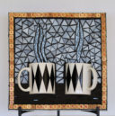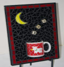 The bold black and white linear design of the coffee mugs inspired this mosaic. The geometrics are continued on the ‘tablecloth’ and ‘walls’. If you peek inside the cups, you’ll see they have ‘coffee’ inside. You can almost smell the aroma of the coffee wafting upwards with the steam.