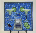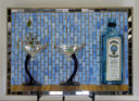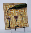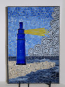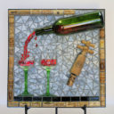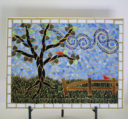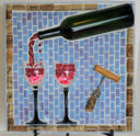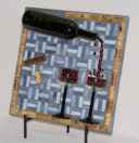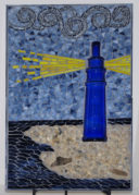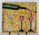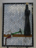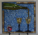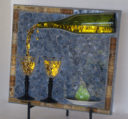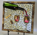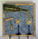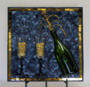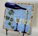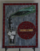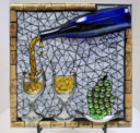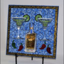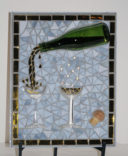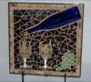 My nephew graciously sacrificed himself to provide me with the Bombay Sapphire bottle. The background is pale blue stained glass. The ‘table’ is darker blue stained glass. I used silver mirror glass for the border and ‘gin’. Sadly, this piece fell off the wall at a gallery. I was crushed, as were the martini glasses.
