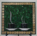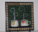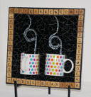 Mugs with silver Van Gogh glass steam, green glass background and Scrabble letters spelling coffee related words as a frame. Finished with black grout.