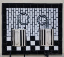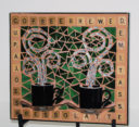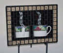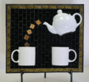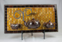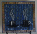 Mugs with silver Van Gogh glass steam, black glass background and Scrabble letters spelling coffee related words as a frame. Finished with black grout.