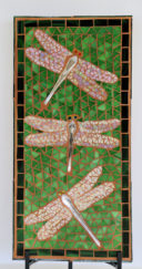 The dragonfly bodies are made from the handles of forks and spoons. Their eyes are millefiori. As the light and angle changes, the colors of their iridescent wings change too.