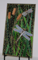 I used black, pot white opal and for the steam, silver Van Gogh glass. Black grout was used to finish the piece, including the edges.
