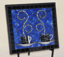 Mugs with silver Van Gogh glass steam, blue glass background and Scrabble letters spelling coffee related words as a frame. Finished with navy blue grout.