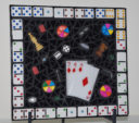 The frame is made from Dominoes. I used black glass for the background. I made the playing cards from fused glass. I included Trivial Pursuit pieces, Clue pieces, chess pieces, dice, Monopoly pieces and a Battleship piece.