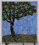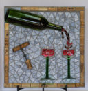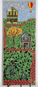 The Mad Hatter’s Tea Party in Alice in Wonderland inspired this mosaic. The lid of the tea pot is removable and if you look inside, you’ll find it is filled with ‘tea.’ The tea is being poured into a mismatched set of china, which is how I’ve always pictured the tea party.