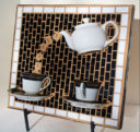 If you remove the lid of the teapot, you’ll find it is filled with ‘tea.’ There is real gold on the rims of the cups and the edges of the saucers of the beautiful china I used in this mosaic.