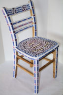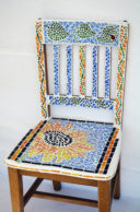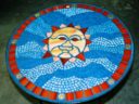 These small occasional tables feature a tree with spring foliage and in Autumn.  If you look carefully at the spring tree, you’ll see a nest of cardinals in the branches.  Momma cardinal is busy collecting worms in the grass.  I made these elements using fused glass.  This is a glass-on-glass mosaic with transparent stained glass glued to clear plate glass.  Do you see the design reflected on the floor from the sun?