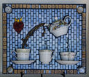 Look closely at the teacups and saucers in this mosaic and you’ll see beautiful Asian ladies in their elegant attire.  This piece is designed to be a companion to Rice Bowls I.