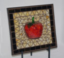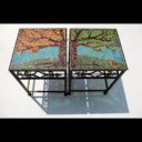 These small occasional tables feature a tree with spring foliage and in Autumn.  If you look carefully at the spring tree, you’ll see a nest of cardinals in the branches.  Momma cardinal is busy collecting worms in the grass.  I made these elements using fused glass.  This is a glass-on-glass mosaic with transparent stained glass glued to clear plate glass.  Do you see the design reflected on the floor from the sun?