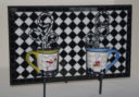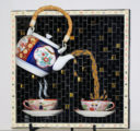 I found the Alice in Wonderland tea pot at St. Vincent de Paul.  It shouted out to be used in one of my 3D mosaics.  The teacups and saucers also came from trips to St. Vinny’s.  In my imagination, the tea party always took place with a mismatched tea set.  The top to the tea pot comes off and if you peek inside, you’ll find it is full of tea, as are the teacups.  Time is a very important issue in this story and is represented by the four pocket watches in the corners.  The Scrabble letters creating the border spell out a quote from Alice in Wonderland, by Lewis Carroll.