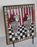 There’s nothing better than an ice cream sundae with all the toppings.  These sundaes feature ‘strawberry’, ‘chocolate’, and ‘vanilla’ ice creams.  You can see the ‘chocolate syrup’ oozing down inside the glasses.  Of course, they’re topped off with a cherry.  Choose your toppings from the ones made up on the Scrabble tiles framing the piece.  The tablecloth and background were inspired by Wilson’s Restaurant & Ice Cream Parlor in Ephraim, Door County, Wisconsin.  Their iconic red and white canopy says ice cream to generations of visitors to Door County.
